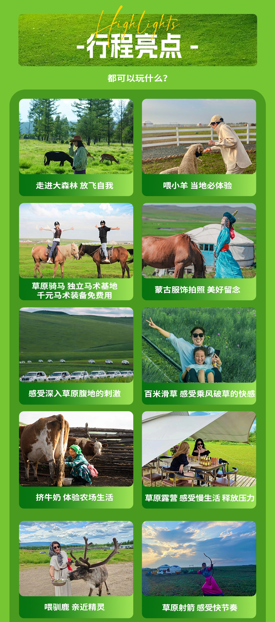 7.贈送娛樂項目:體驗(yàn)式騎馬、穿蒙古服飾拍照、擠牛奶、喂小羊、草原托馬斯、射箭、品嘗蒙古小吃、篝火晚會、俄羅斯家庭表演、旅行社責(zé)任險、人身意外險(雙重保險為我們的旅行保駕護(hù)航)