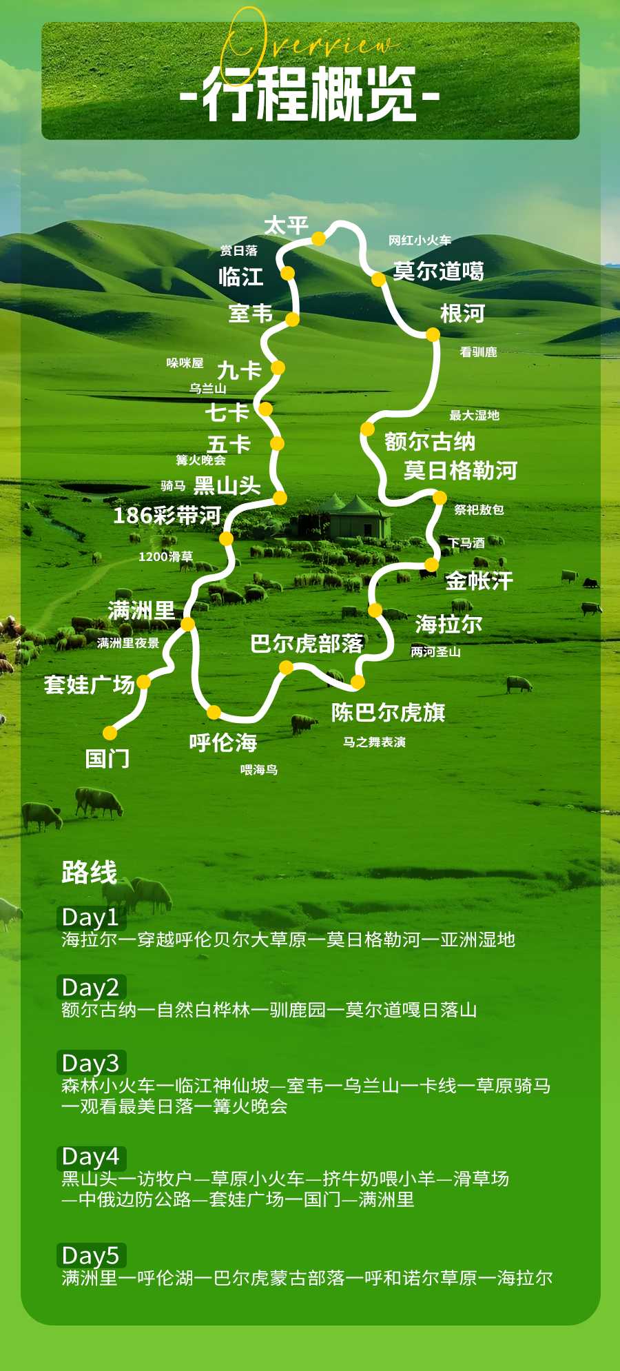特別注明:本線路為呼倫貝爾暢游草原戶外俱樂部獨(dú)創(chuàng)路線,本線路為濃縮型,5天路線看的是6天風(fēng)景,所包含的景區(qū)與游玩的項目同比其他家要多出很多?。。?!