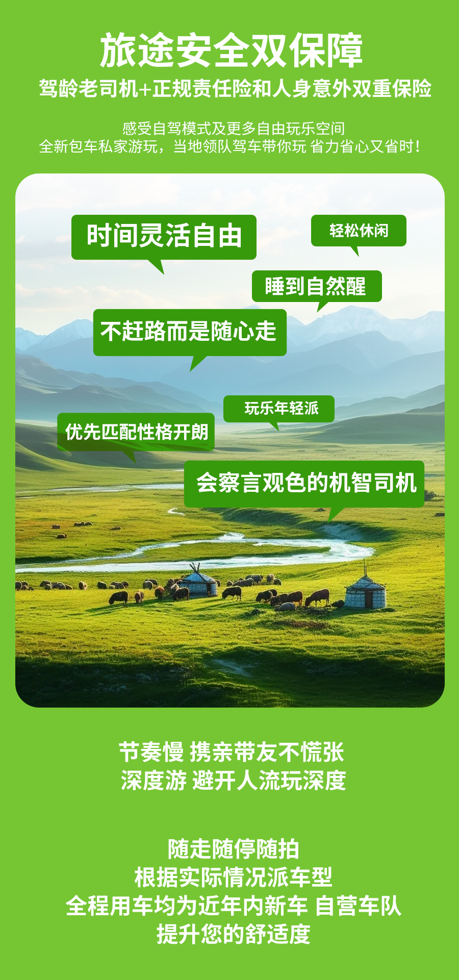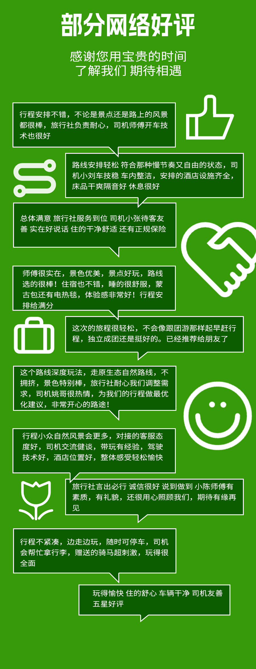 1.免費(fèi)接機(jī)/火車安排當(dāng)晚住宿,小眾玩法,此線路感受沒有被商業(yè)化的原生態(tài)大自然美景,短暫的離開現(xiàn)實(shí)生活 親近大自然 讓您感受游牧文化 ,給您和家人多一次陪伴旅行 情侶多一次親密感 老人多一份健康 孩子多一次體驗(yàn), 我們用心規(guī)劃旅行一定讓您消費(fèi)的值得 更豐富的人生體驗(yàn)