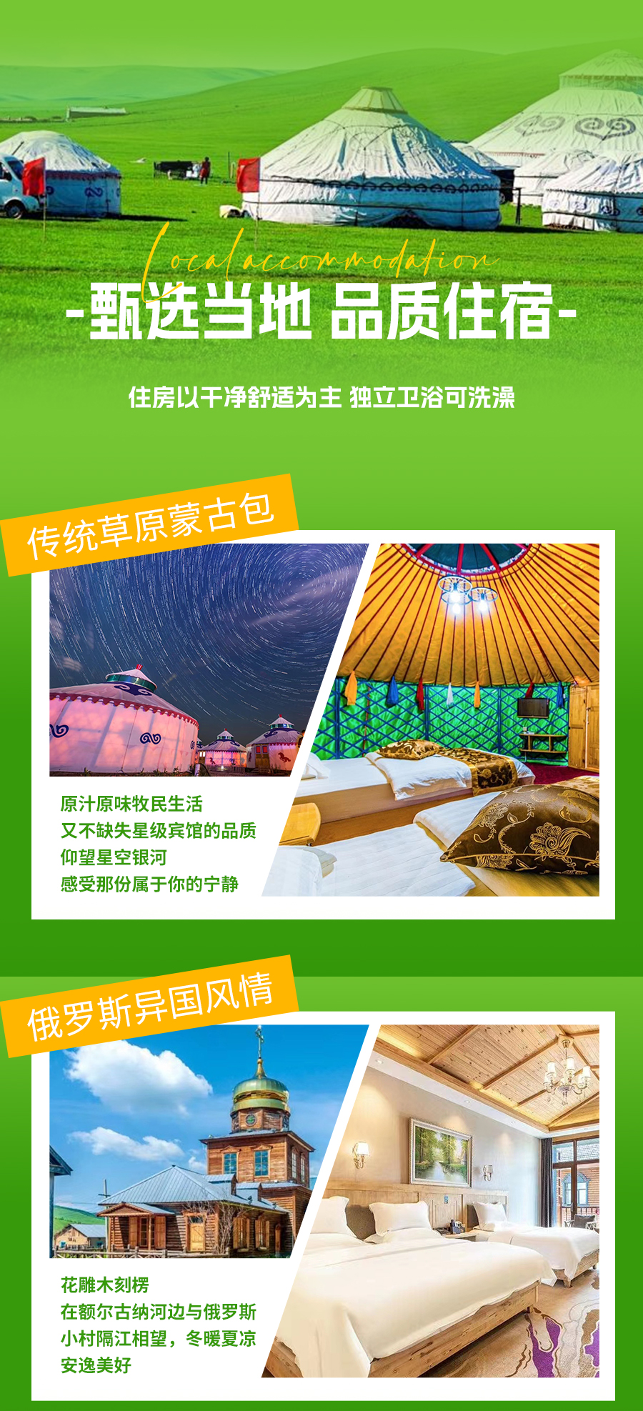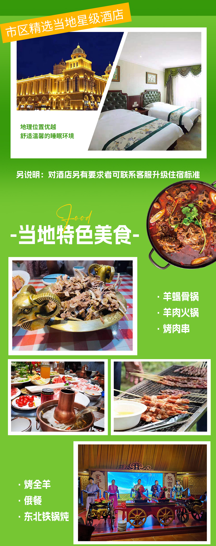 ②套餐住宿:萬(wàn)庭深呼吸主題酒店、中科麗麗婭俄式酒店、云頓酒店、蒙星大酒店、伊戈莊園、千鶴大酒店、葉尼塞莊園、古納國(guó)與際酒店、額爾古納大酒店