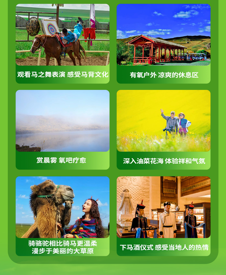 7.贈(zèng)送娛樂項(xiàng)目:體驗(yàn)式騎馬、穿蒙古服飾拍照、擠牛奶、喂小羊、草原托馬斯、射箭、品嘗蒙古小吃、篝火晚會(huì)、俄羅斯家庭表演、旅行社責(zé)任險(xiǎn)、人身意外險(xiǎn)(雙重保險(xiǎn)為我們的旅行保駕護(hù)航)