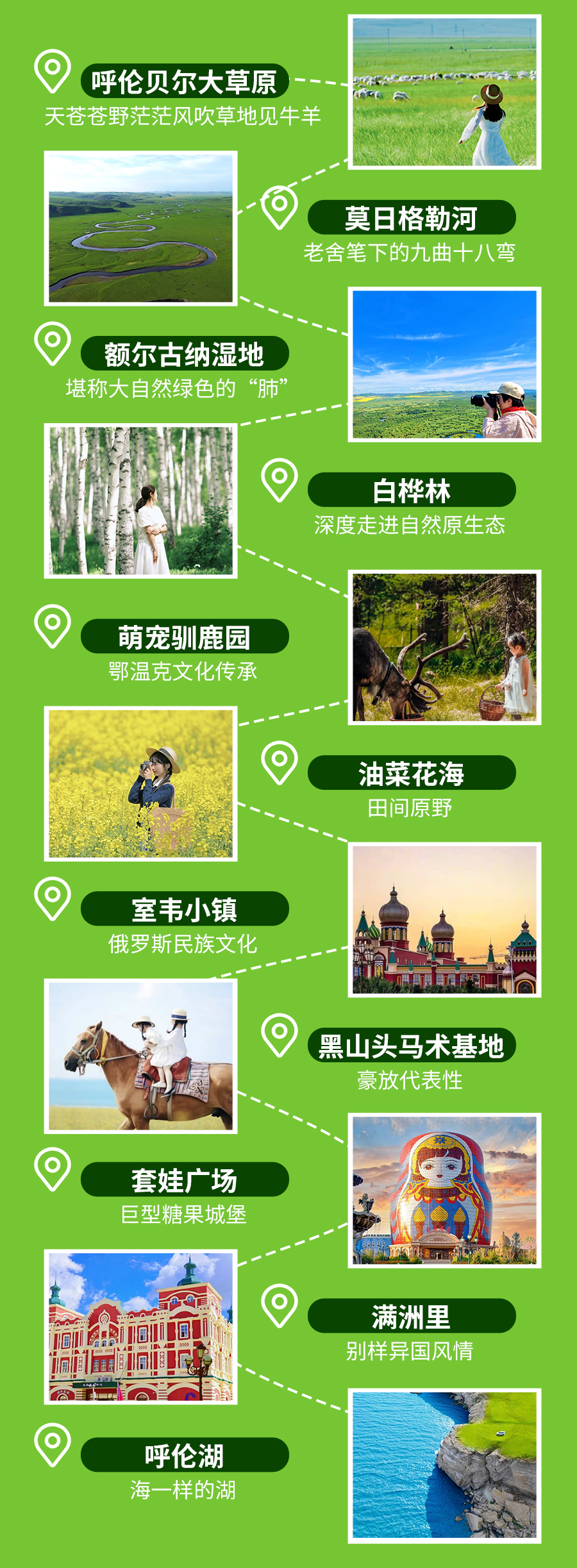①此路線是到呼倫貝爾當(dāng)?shù)丶兺鎸?shí)在天數(shù),而不是像其他家集合日和返程日算兩天行程,例如:其它家集合日1天+游玩3天+返程1天=5日游;本公司當(dāng)?shù)?日游(集合日1天+游玩5天=6日游)