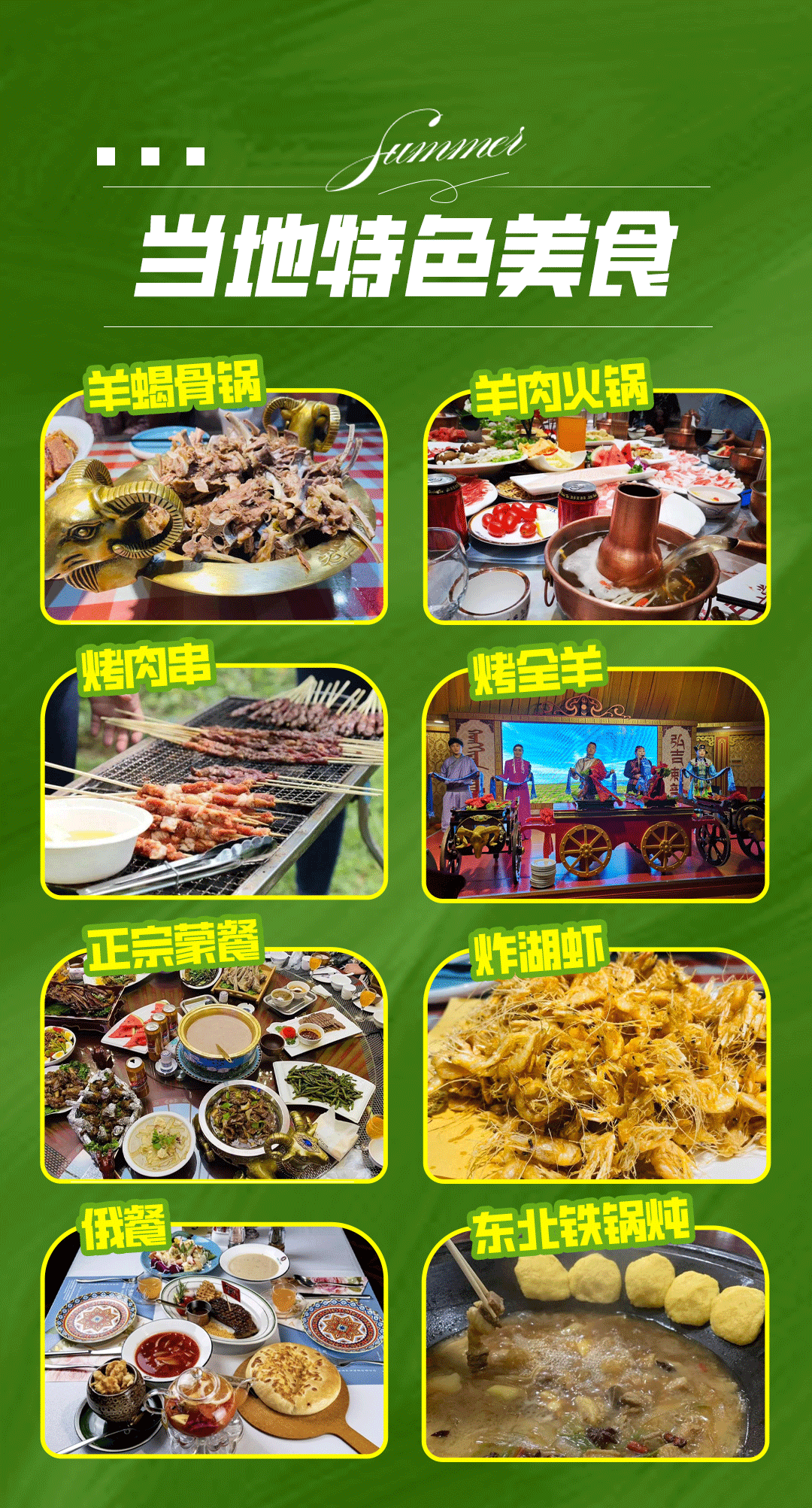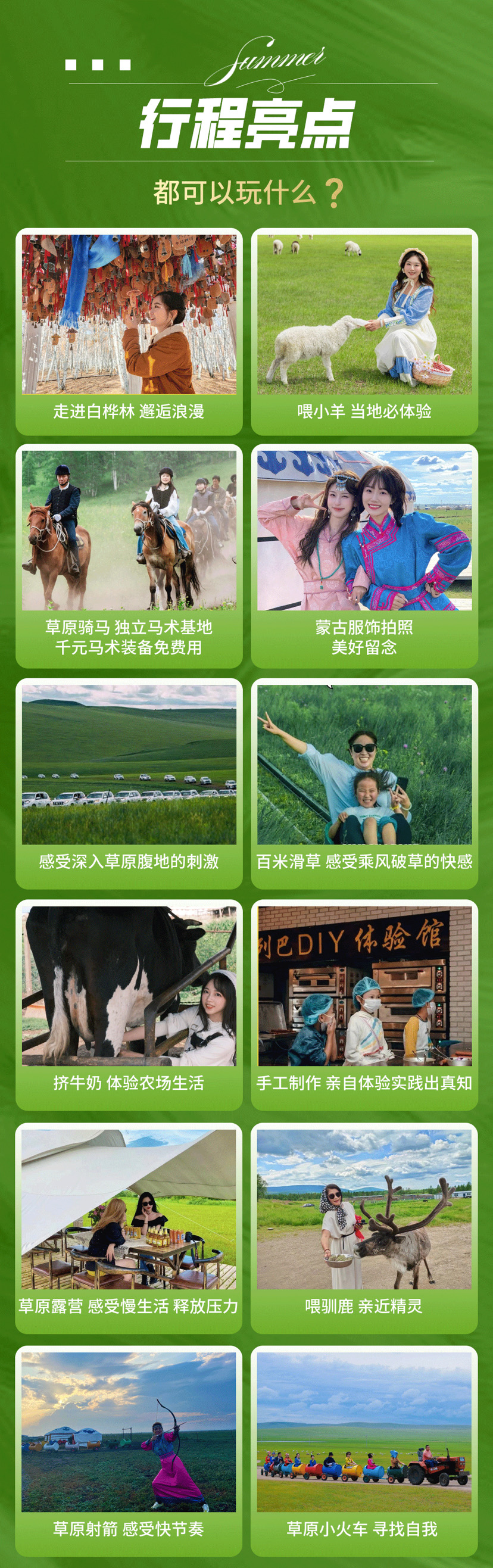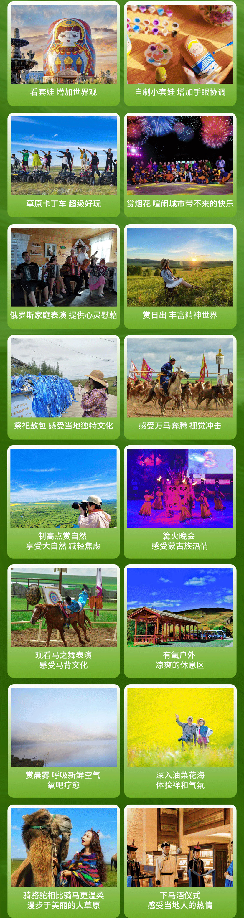 7.贈送娛樂項目:穿蒙古服飾拍照、擠牛奶、喂小羊、草原托馬斯、品嘗蒙古小吃、祭祀敖包、蒙古小課堂、蒙古燒燙氈畫、網(wǎng)紅天梯打卡、篝火晚會、民族樂器展示、夜游滿洲里、旅行社責任險、人身意外險(雙重保險為我們的旅行保駕護航)