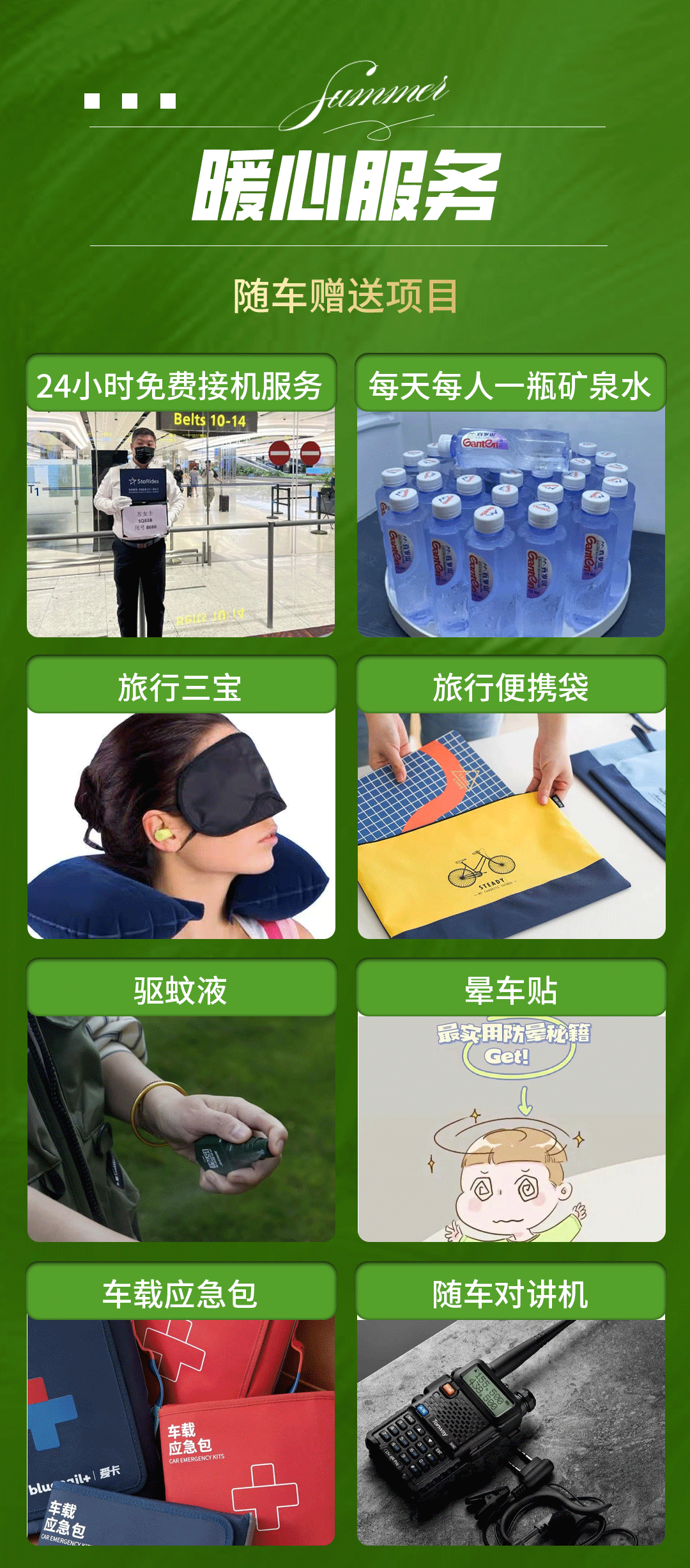 4、團隊會攜帶吹風機、一次性雨衣、風油精、防蚊液、衣服掛、插排、礦泉水等物品,供大家旅途中隨時取用。