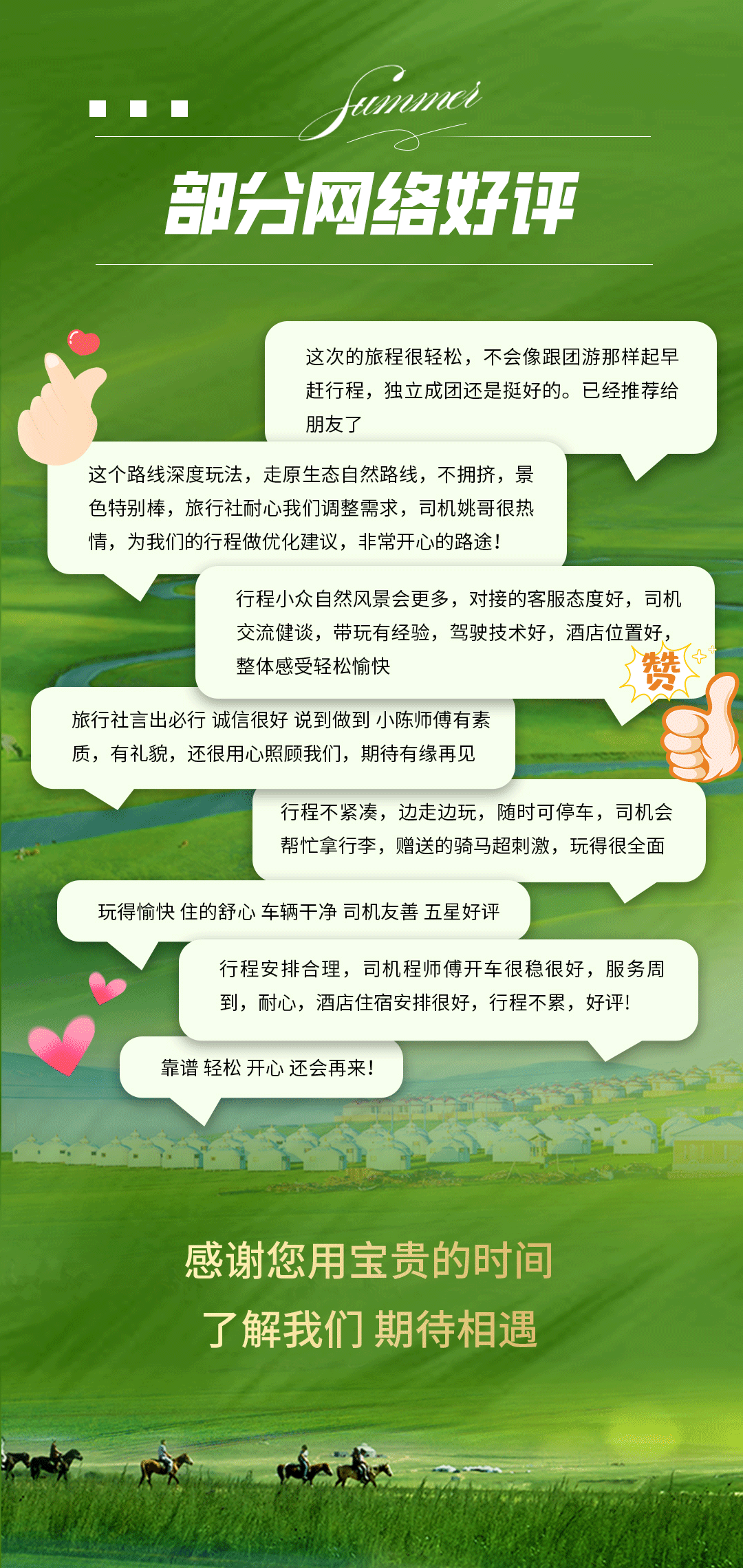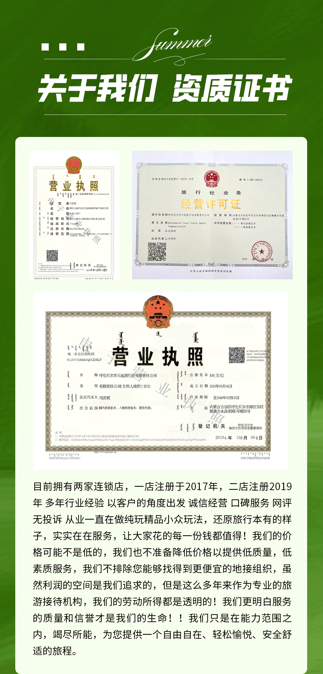 3.眾多好評口碑宣傳,我們專注戶外純玩原生態(tài)體驗式旅行、行程為八字環(huán)線不走回頭路避免重復路程,會讓您的呼倫貝爾之旅不虛此行