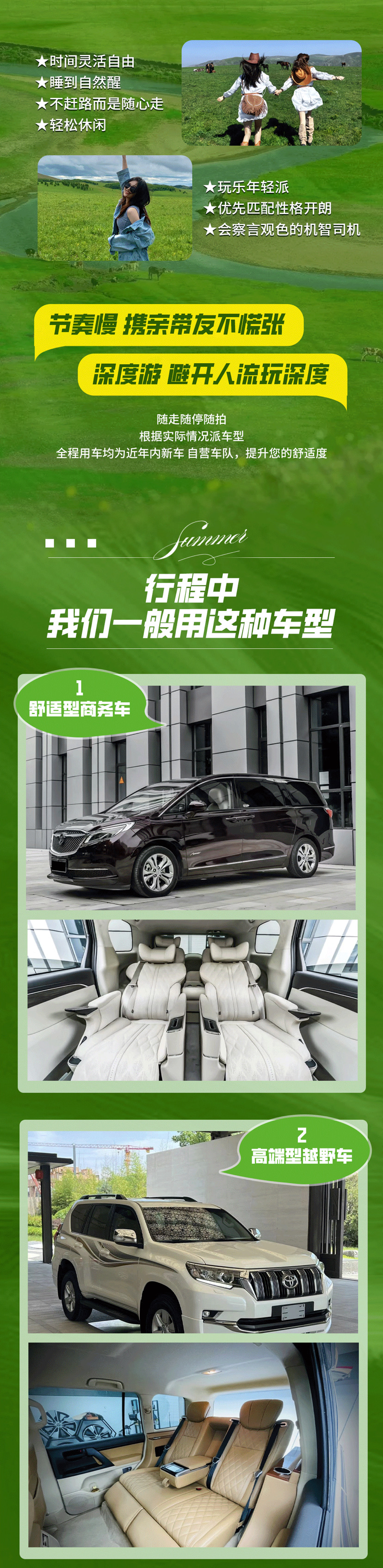 4.行程特色《準新越野車/suv穿越草原、新車提升路途中的舒適度、輕松休閑行程、更符合大眾旅游標準、主打自由行》