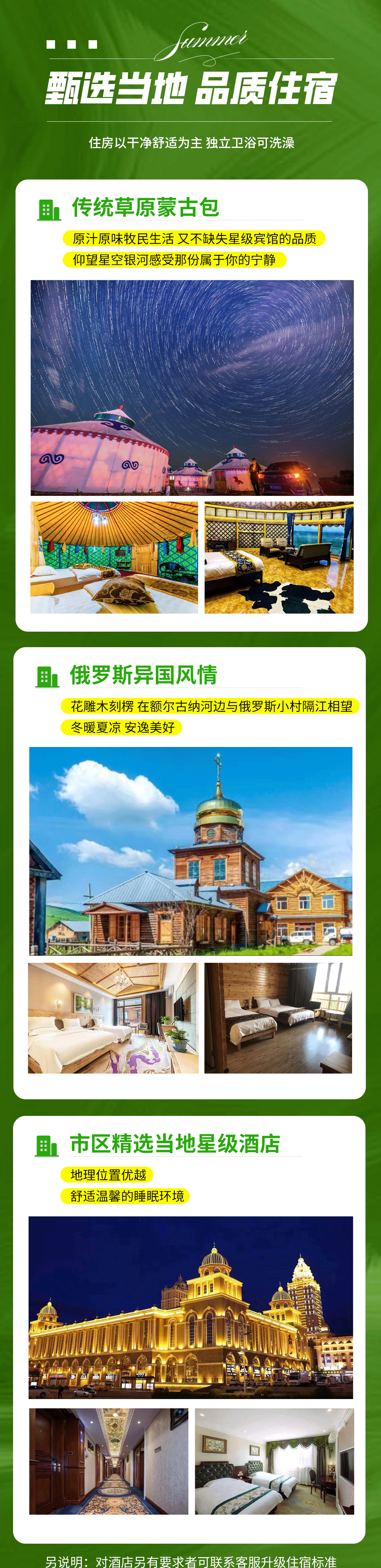 ②套餐住宿:蒙星大酒店、萬庭深呼吸主題酒店、中科麗麗婭俄式酒店、伊戈莊園、千鶴大酒店、葉尼塞莊園、古納國與際酒店、額爾古納大酒店